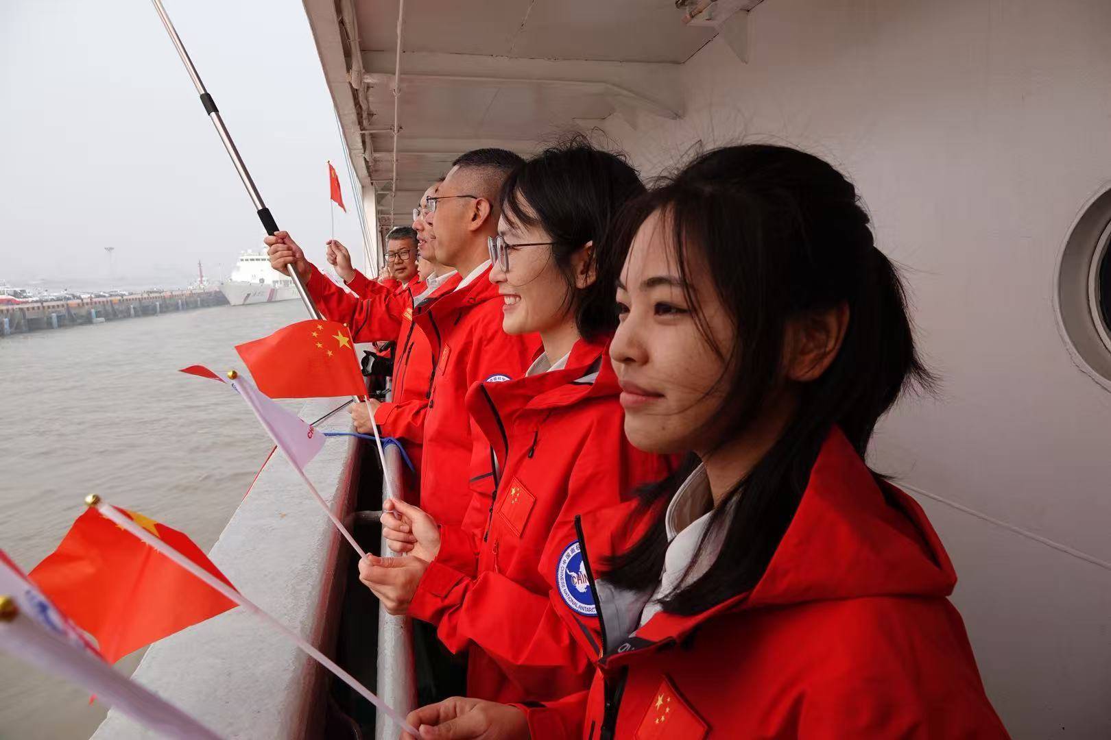 船上,身着统一红色冲锋衣的中国第42次南极考察队队员们,挥舞着五星红旗和南极考察队队旗;码头上,送行的人群挥舞着手臂,目光紧紧追随亲人的身影。