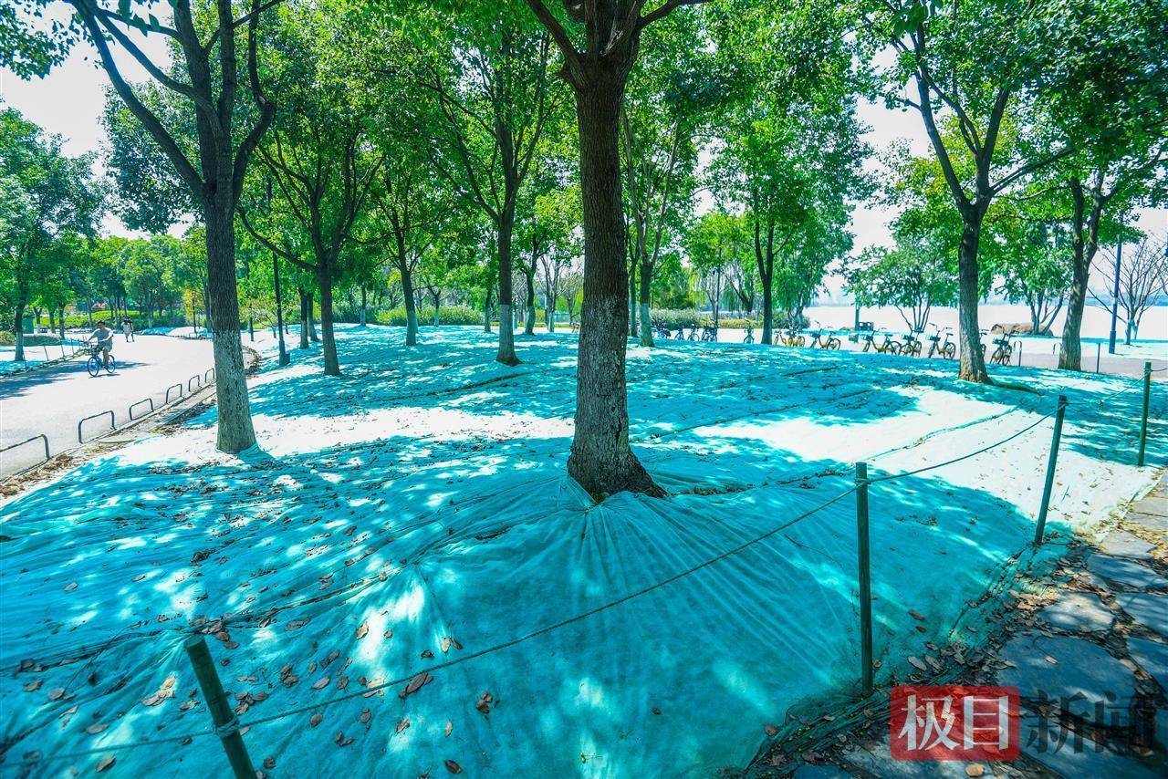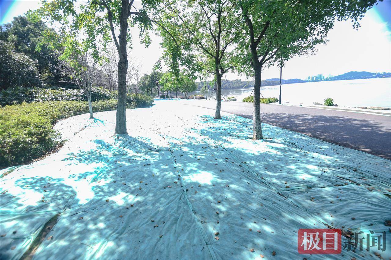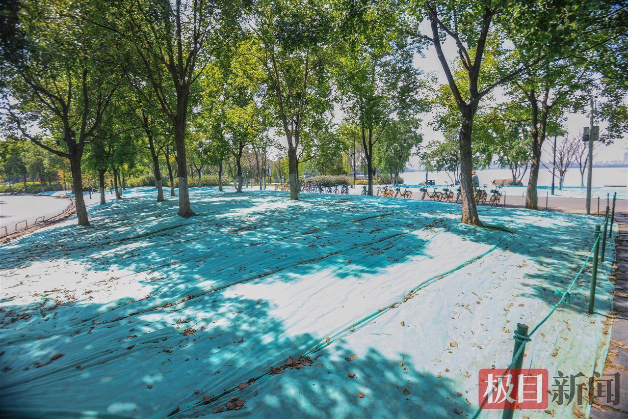 据悉,从10月初开始,东湖景区在绿道草坪上播种了30万平方米的冷季型草种——黑麦草,对原有的枯黄草坪进行全面更换。盖上薄膜是为了保持一个相对湿润、适宜草种生长的环境,也是为了防止鸟类、松鼠等野生动物啄食草种。预计15天后,小草会开始萌芽和生长。揭开薄膜后,到时整个绿道将焕然一新,如春天般生机勃勃。草坪“春”意盎然的状态可持续至次年4月,其中最佳观赏期为次年1月-4月。